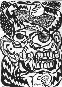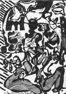 The first two pictures are very wild, the first reminding me of a whacked out cannibal on an un-charted island, the second looking like the kind of poster you'd see on the wall behind one of those hippie characters in the movie "Billy Jack." The last one is almost really three pictures in one. The top part looks like space aliens taking over Zulu warriors, the middle part is hard to describe, but I see a cow in it and two giant eyes above. The bottom part of it makes me think of the three stooges for some reason.